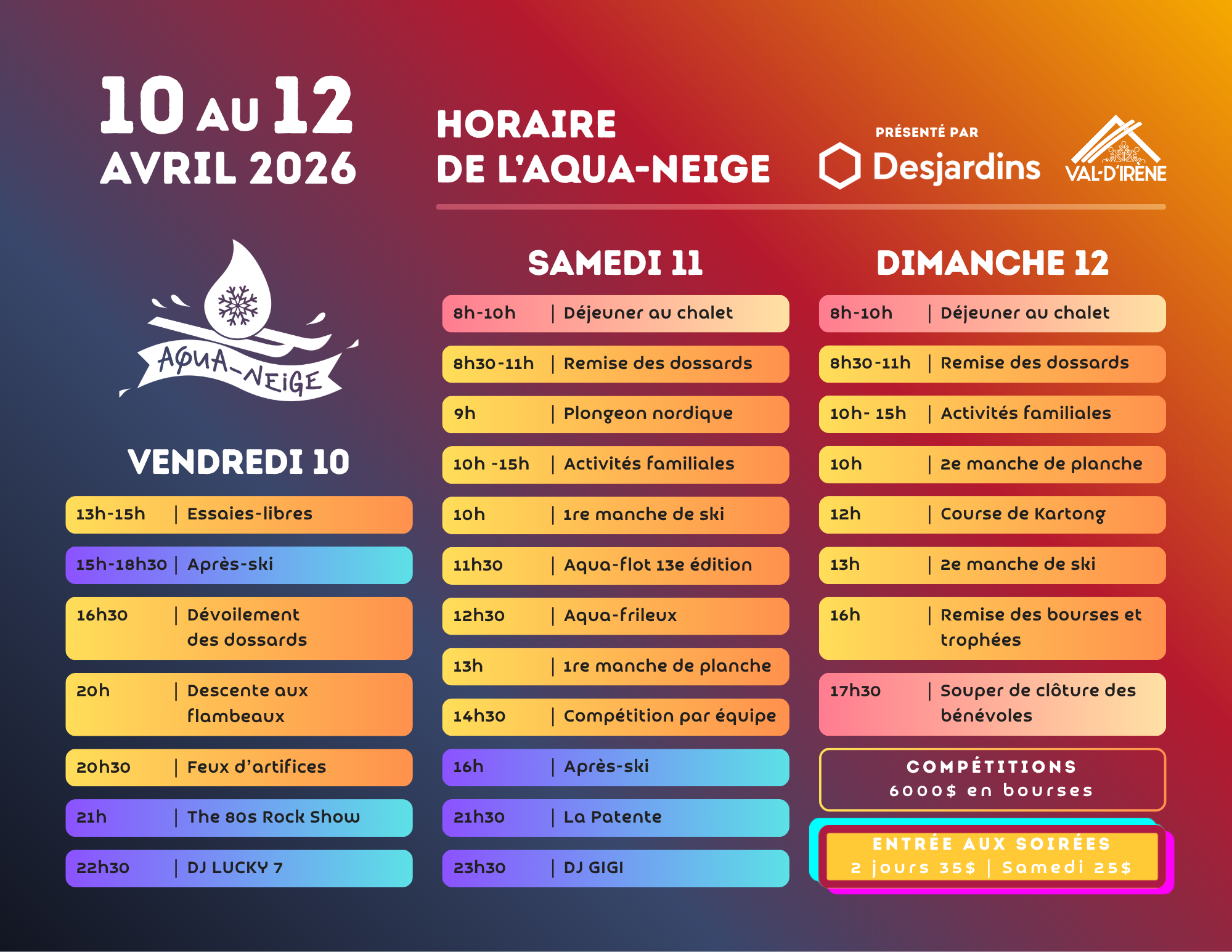 Aqua-Neige is from April 10 to 12! Do not miss this unique event to come and see the intrepid competitors attempt to cross Lac Picalo! Weekend activities and evening shows!